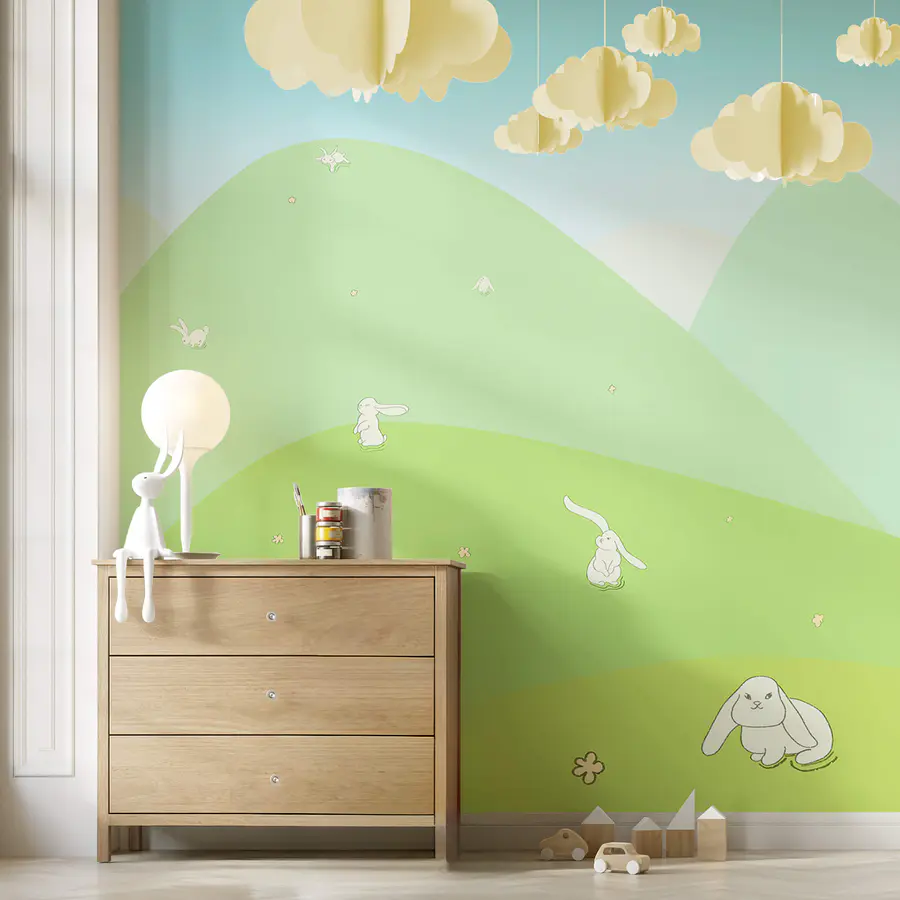 Fotomurales Dibujo animado de conejitos en una colina verde
