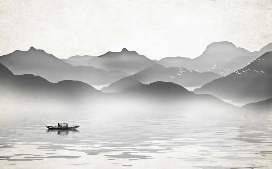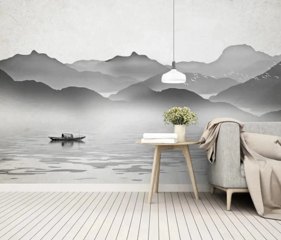 Fotomurales Barco sobre el agua con montañas al fondo