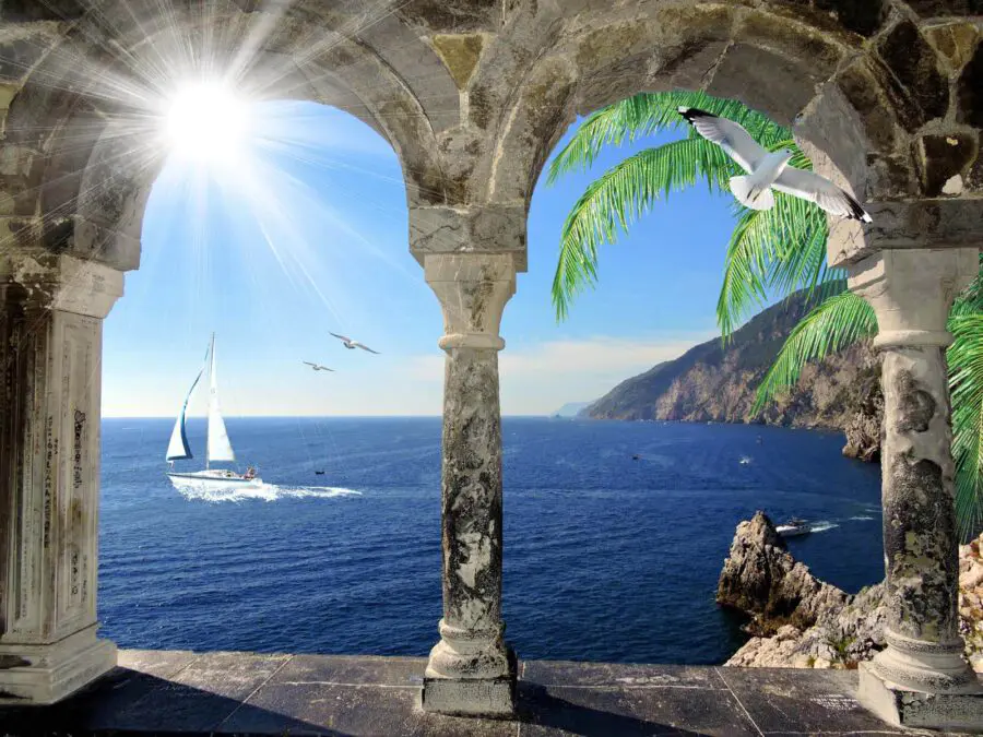 14.39 €7.91 €Fotomurales Balcón con una palmera y un velero en el agua