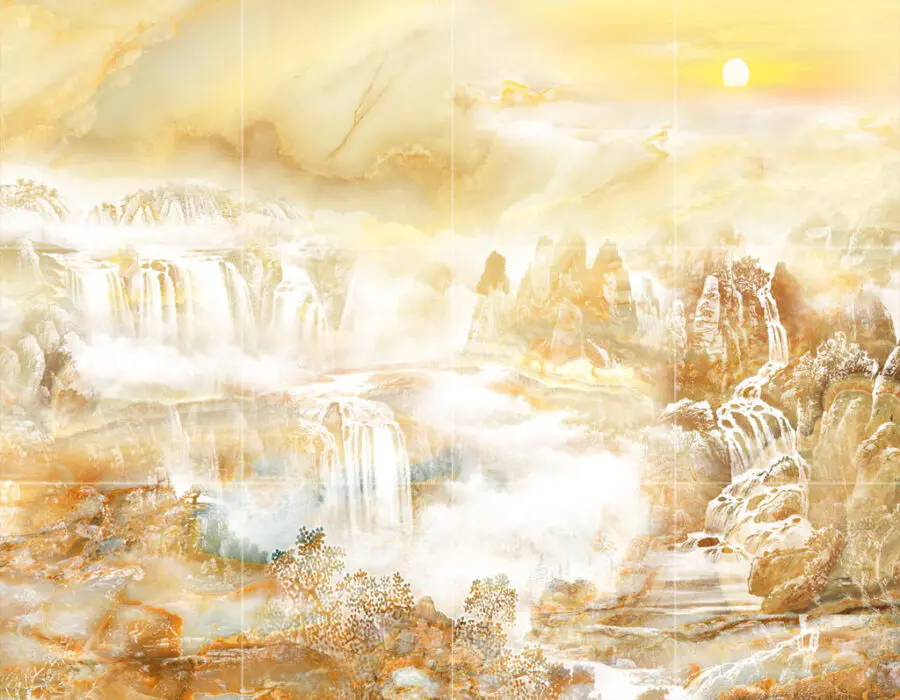 Fotomurales Pintura de una cascada y montañas