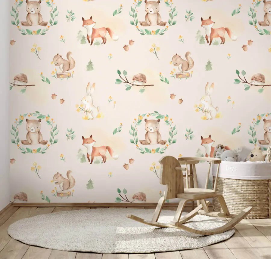 Imagina que entras en una acogedora habitación y te recibe un encantador desfile de amigos del bosque. Este mural de pared presenta animales adorables como ardillas, conejos y un oso muy tranquilo que parece estar meditando. Cada personaje parece cobrar vida, aportando un toque de naturaleza al interior. Las suaves acuarelas crean un ambiente de ensueño, perfecto para la habitación de un niño o para cualquier espacio que busque un toque de fantasía. Es como tener un trocito de bosque en casa: ¿quién no sonreiría mientras se toma un café junto a un simpático zorro? Este mural no sólo decora, sino que cuenta una historia, invitando a todos a soñar un poco. Además, es un gran tema de conversación: ¡nadie puede resistirse a hablar de ese simpático erizo!