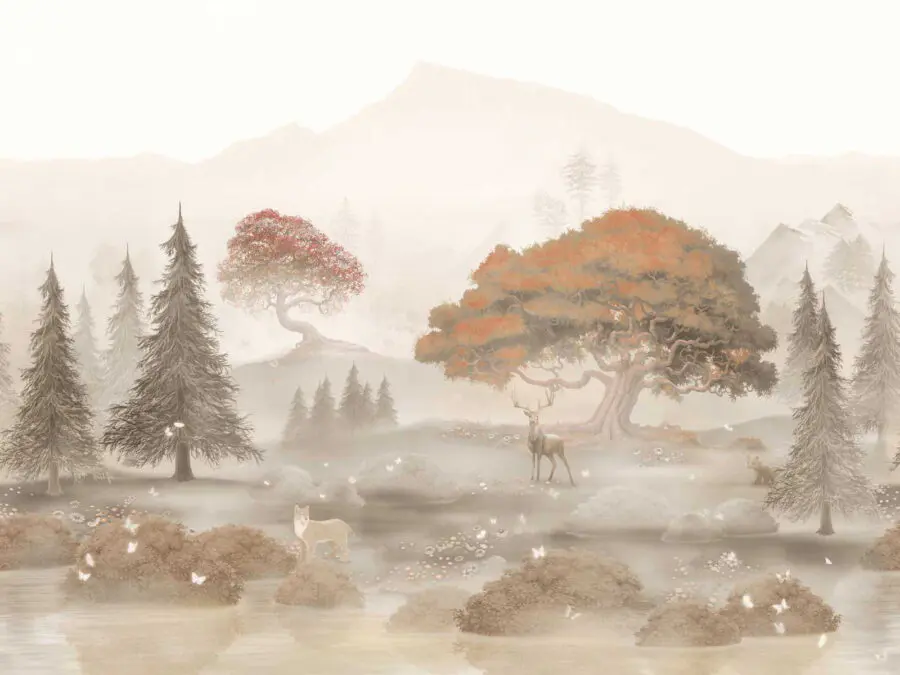 Fotomurales Pintura de un bosque con árboles y montañas