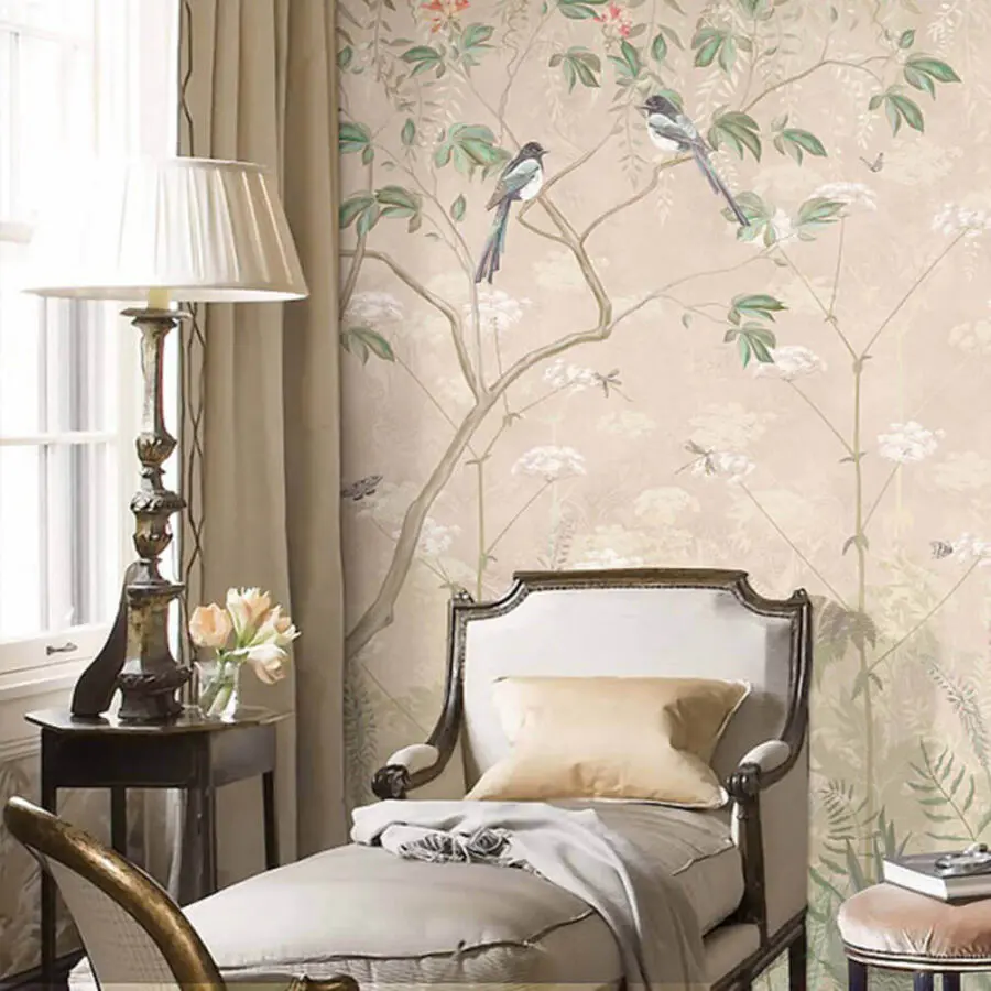 Fotomurales Papel pintado con pájaros sobre árboles y flores