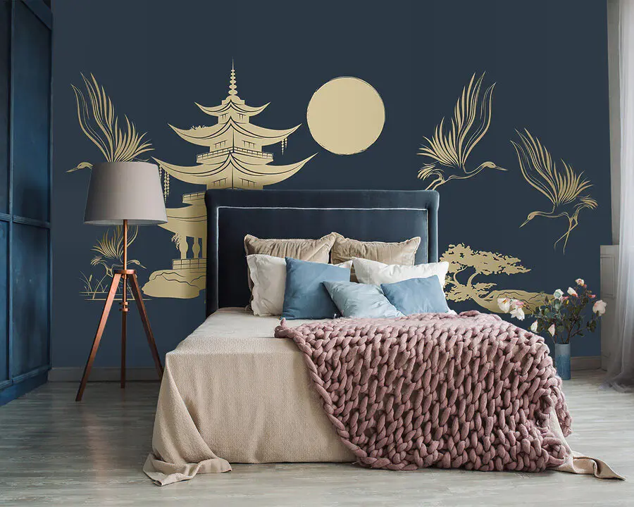 Fotomurales Dibujo de una pagoda y grullas