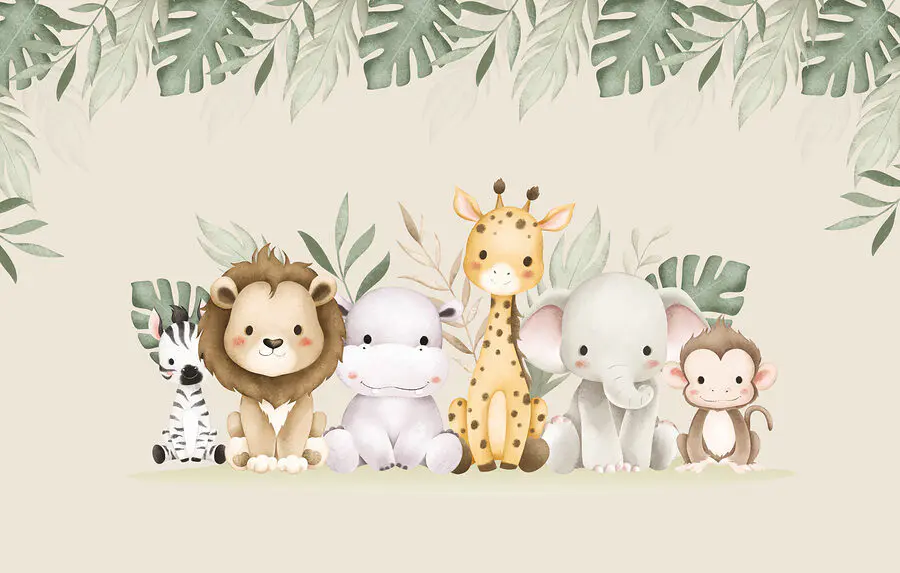 ¡Hola! Si lo que buscas es alegrar una habitación, echa un vistazo a este encantador mural de animales adorables pasando el rato junto a unas frondosas hojas. Está sacado de un libro de cuentos. Este grupo de un león, una jirafa y sus amigos de la selva aportará un ambiente maravilloso y juguetón a cualquier espacio. Imagínate que te despiertas cada mañana con esas caritas tan monas: ¡te levantan el ánimo al instante! Es perfecto para la habitación de un niño o un cuarto infantil, pero seamos sinceros, cualquier amante de los animales adoraría tener a estas dulces criaturas en su pared. Los colores suaves y las simpáticas caritas seguro que hacen sonreír a todo el mundo. El fondo frondoso añade un toque fresco y verde, casi como si te estuvieras asomando a una jungla mágica. Además, es una forma estupenda de despertar la curiosidad y la diversión de los más pequeños. ¿Lo ves? Un toque de alegría para animar toda la habitación.
