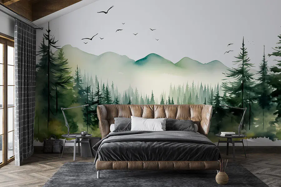 Fotomurales Acuarela de un bosque y montañas