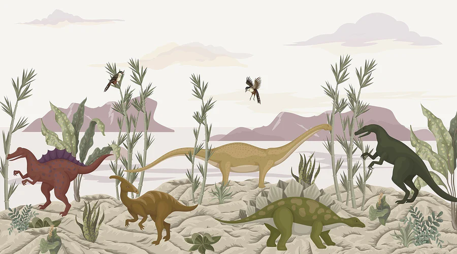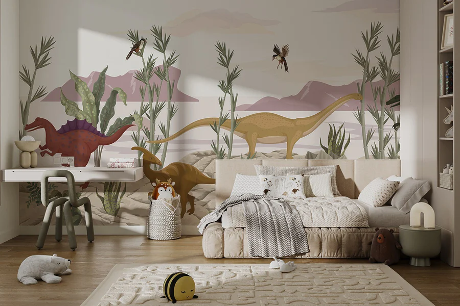 Transforme su espacio en un paraíso prehistórico con este cautivador mural de pared que muestra una bandada de dinosaurios deambulando por un desierto iluminado por el sol. Imagínese que los ricos colores dan vida a sus paredes, mientras estas magníficas criaturas despiertan interminables conversaciones y recuerdos de la infancia. No es sólo decoración; ¡es una aventura que espera ser explorada! Perfecto para una habitación de juegos o incluso para un rincón acogedor, este mural crea un telón de fondo que es como entrar en otro mundo. Imagínatelo: noches de cine con temática de dinosaurios o sesiones de cuentacuentos que capturan la imaginación de los más pequeños. La vibrante escena mantendrá vivo el espíritu de aventura, a la vez que añade un toque de encanto inusual a cualquier habitación.